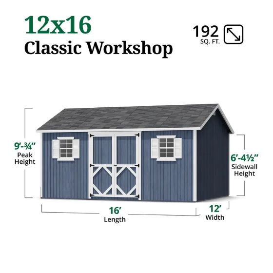 The Classic Workshop Shed offers a bright, spacious, and secure space for projects, storage, or everyday use. Built with durable LP SmartSide siding and strong 2x4 wood construction, it’s designed to withstand the elements while providing plenty of room and customizable options. Pre-cut materials and detailed instructions make assembly easy. For more details, please call 888-609-5487.