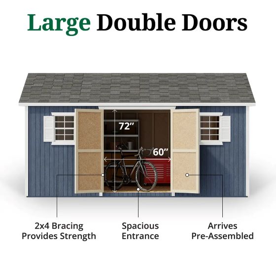 Pre-assembled Large double doors with locking door handle and 2x4 bracing to prevent sagging