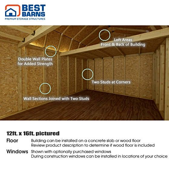 From the Handcrafted Homestead Series, the 12x16 Wood Storage Barn Kit offers a practical and stylish solution for homeowners seeking functional, customizable storage with timeless barn aesthetics. Ideal for a backyard workshop, tool organization, or a creative retreat, the Homestead adapts to your space and personal style. Its gambrel roof and split loft design combine classic barn charm with modern usability. The 7' sidewalls and 10'10" center peak height provide generous headroom and vertical storage, making it comfortable for taller individuals and perfect for storing large items. The split loft offers additional space for seasonal items, bins, or tools, while a fully functional loft door on the gable side makes loading lightweight items easy and convenient. Constructed using Best Barns SecureTruss technology, TimberPrestige premium Eurowood, and precision pre-cut materials, this kit ensures long-lasting durability and a straightforward DIY assembly. Designed for confident builders, the Homestead 12x16 delivers a cost-effective, high-quality solution for creating a versatile, organized, and stylish backyard space. (previously sold as the Millcreek shed kit, this is the same shed reworked for better quality and marketing)
