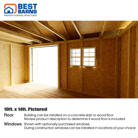 The Specialty Overhang Oasis 10x10 Wood Storage Shed Kit is the perfect combination of style, function, and customization. Featuring a modern gable roof with an extended overhang, this shed not only protects the entryway from the elements but also adds a sleek, contemporary touch to your backyard. Inside, a split overhead loft with a maximum height of 2'1" provides useful space for storing boxes, seasonal items, or small tools, while the 6'4" sidewalls and generous headroom ensure ease of movement and accessibility. Constructed with Best Barns' SecureTruss system, TimberPrestige premium Eurowood, and precision pre-cut materials, this DIY-friendly kit ensures a durable, long-lasting structure and simple assembly. The exterior features LP SmartSide panels, primed and ready for your personal paint finish, offering superior resistance to weather, rot, and pests.