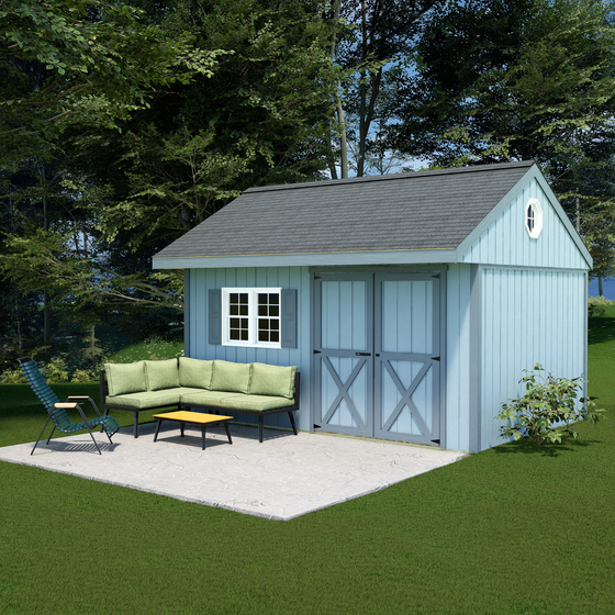 A sleek and modern 10x14 wood storage shed featuring a gable roof with a deep eave overhang, large barn doors, and a spacious loft for added storage perfect for organizing your backyard essentials in style.