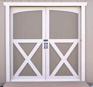 This shed comes equipped with Each door is built with pre-primed wood siding mounted on a sturdy 2×4 frame for exceptional durability. The exterior is finished with unfinished white pine trim for a classic look. Doors glide effortlessly along a heavy-duty aluminum track, and both a galvanized door sill and latch are included for secure closure.