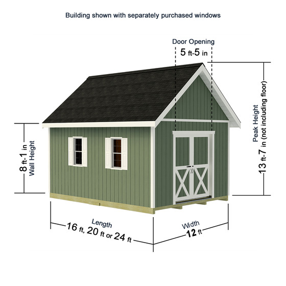 The shed shown in images features optional upgrades such as decorative windows with shutters, a sunburst gable window, flooring, and a full roofing package - all sold separately. Add these and other available options above!
