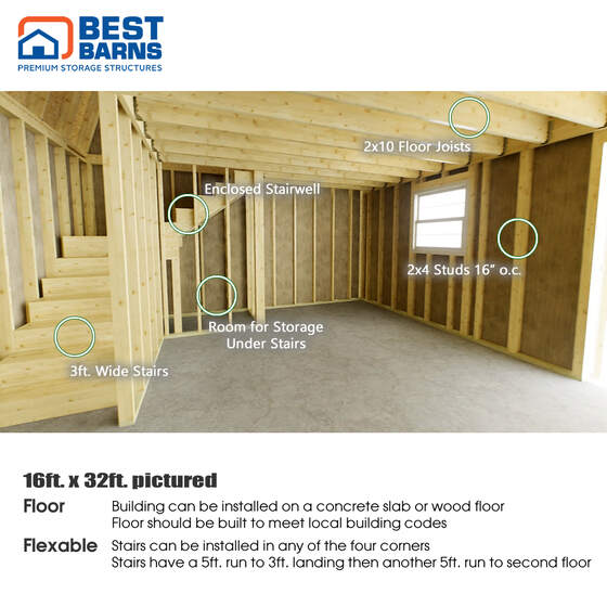 The upper loft features sturdy 2x10 joists spaced 16 inches on center, providing reliable support for storage or workspace