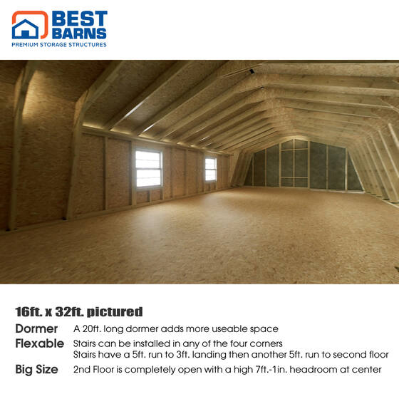 Transform your property with the Crafted Colossal 16x28 Elite Series Wood Barndominium Kit with Dormer Windows a spacious, two-story structure that blends strength, versatility, and visual appeal.The main level offers 7' 3" of headroom, perfect for storing mowers, ATVs, small tractors, and other large equipment. Upstairs, the second floor provides 7' 1" of clearance at the peak, creating plenty of room for seasonal storage, furniture, or a flexible living or recreation area.