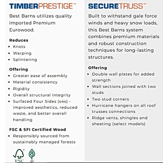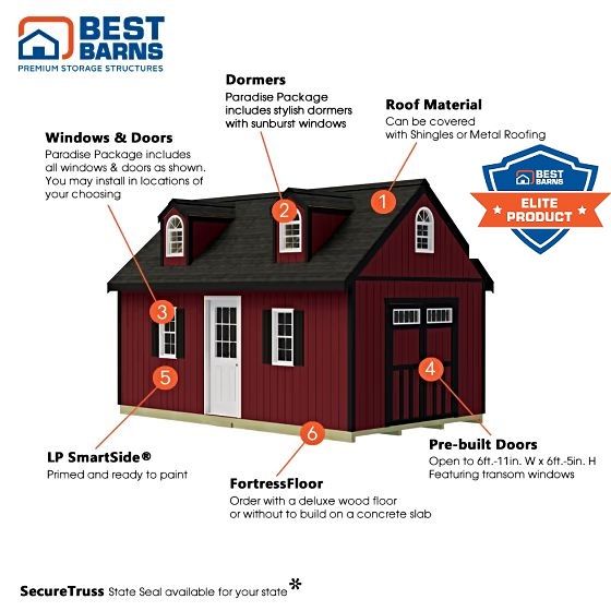 Constructed using the Best Barns SecureTruss System, TimberPrestige imported Eurowood, and precision pre-cut components, this shed ensures professional-grade strength and straightforward assembly. The exterior is clad in LP SmartSide siding, factory-primed and paint-ready, engineered to withstand pests, rot, and harsh weather for long-lasting beauty and reliability.Whether you’re designing a home office, backyard getaway, or a premium storage solution, the Planner’s Paradise Elite Series combines craftsmanship, adaptability, and elegance, transforming your outdoor space into a refined and functional retreat.(previously sold as the Hampton shed kit, this is the same shed reworked for better quality and marketing).