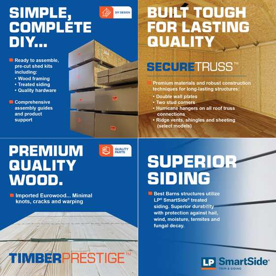 Built with TimberPrestige premium Eurowood and reinforced by Best Barns SecureTruss framing, it offers exceptional strength and long-term durability. Each part is pre-cut for a straightforward build that’s ideal for DIYers.