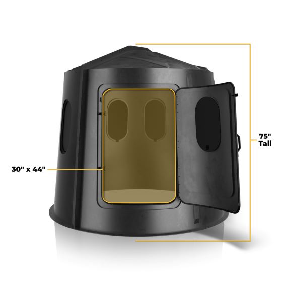 The lightweight, two-piece design allows for quick assembly and easy transportation, while the generous interior dimensions — 6'6" in diameter and 6'3" tall at the center ensure a comfortable hunting experience. Weighing approximately 125 lbs when fully assembled, the 6-Shooter offers the perfect balance of strength and portability. Whether you're a seasoned hunter or just getting started, the Maverick 6-Shooter provides the reliability, concealment, and comfort you need for a successful hunt.