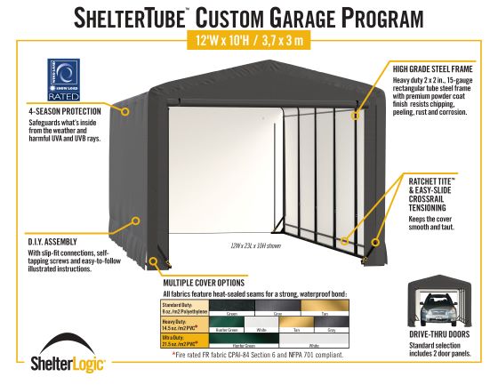 The newly improved and redesigned ShelterTube garage and storage shelter is an outstanding solution for anyone seeking reliable year-round protection for their vehicles, boats, and other valuable items. This innovative shelter is constructed with a robust industrial-strength steel frame, ensuring durability and stability in various weather conditions. Its 9 oz. waterproof rugged fabric cover provides an additional layer of protection against rain, snow, and UV rays, making it ideal for year-round use. Designed to withstand tough weather, the ShelterLogic garage is wind and snow-load rated, meaning it can handle significant environmental challenges when properly anchored and maintained with adequate snow removal. This feature makes it a dependable choice for those living in areas prone to harsh winters or strong winds. Moreover, the ShelterTube offers customization options to meet your specific needs, allowing you to order sizes up to 100 feet long and 20 feet wide. Whether you need a compact storage solution or a spacious garage for multiple vehicles, the ShelterTube can be tailored to fit your requirements perfectly. With its combination of strength, versatility, and customization options, the ShelterTube is an exceptional investment for protecting your assets throughout the year.