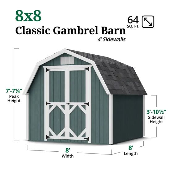 The Classic Gambrel 8x8 Barn with 4-foot sidewalls brings timeless barn style to your backyard with its iconic roof design and added overhead storage. The walk-in height sidewalls make organization simple, while the locking door handle ensures security. Delivered primed and ready to paint, this shed is a durable and classic choice for everyday storage needs. For more information, contact us at 888-609-5487!