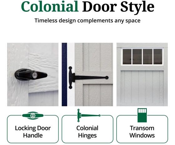 The Colonial Greenfield Barn reimagines traditional barn style with refined colonial detailing and practical craftsmanship. Designed with a gambrel roof, this barn offers increased headroom, making it ideal for storing taller equipment and keeping your space well organized. Thoughtful exterior accents like oversized colonial hinges, transom windows, and decorative louvers enhance both function and visual appeal while helping manage airflow and moisture.