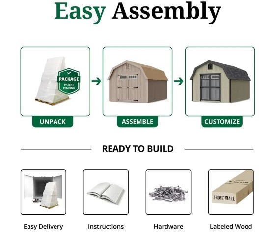 Constructed with durable 2x4 framing and premium 7/16 in. LP SmartSide siding, the barn is engineered to stand up to outdoor conditions year after year. The siding is factory-primed, resistant to decay and insects, and ready for your custom paint color. All components arrive pre-cut and clearly labeled, streamlining the assembly process.