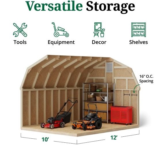 Its gambrel roof design provides increased headroom, making it easier to store taller equipment and stay organized inside the spacious interior. Decorative colonial louvers help prevent moisture buildup, while the extended roof overhang and LP SmartSide corner trim add architectural appeal. Designed for convenience, all wood components are pre-cut, labeled, and ready for assembly, with all necessary hardware and detailed instructions included. Pre-assembled double doors feature large colonial hinges, transom windows, and a locking door handle for both style and security.