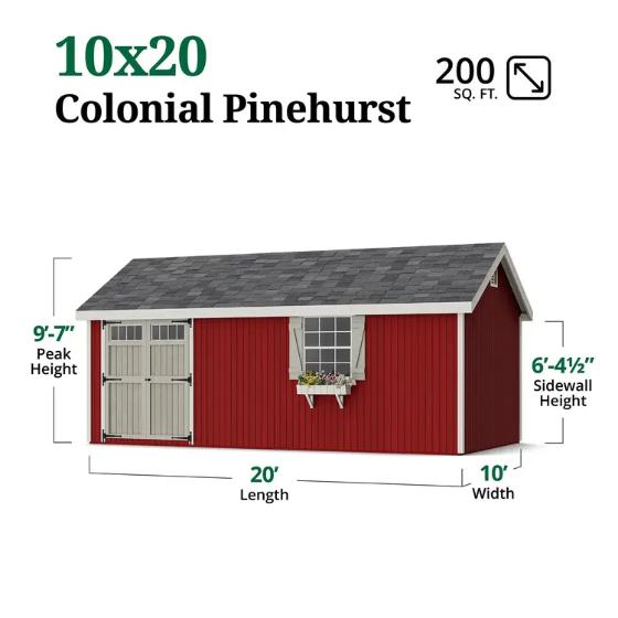 The Little Cottage Co. 10x20 Colonial Pinehurst shed offers timeless Colonial styling paired with practical everyday functionality. Designed with classic Colonial-style doors and decorative hinges, it adds subtle character and curb appeal to any backyard. A functional window and built-in vent allow natural light and fresh air to circulate, creating a brighter and more comfortable interior. Finished with paint-ready wood siding, the shed is easy to customize to complement your home’s exterior. Whether used for storage, hobbies, or as a quiet backyard retreat, the Colonial Pinehurst delivers versatility, durability, and classic charm in a range of spacious size options.