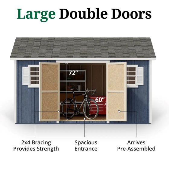 Pre-assembled Large double doors with locking door handle and 2x4 bracing to prevent sagging