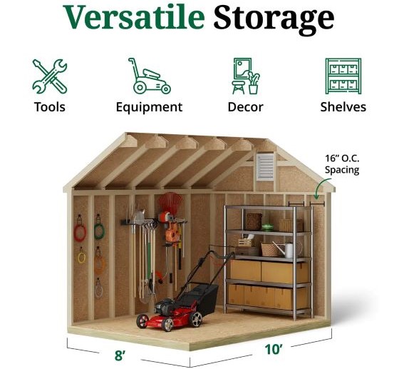 The Colonial Williamsburg Shed brings classic colonial elegance and dependable storage to your outdoor space. Designed with a traditional gable roof, decorative colonial louvers, and extended roof overhangs, this shed adds architectural charm while delivering everyday functionality. Whether used as a pool house, potting shed, garden retreat, or general storage solution, it enhances both the look and usability of your backyard. Built for strength and longevity, the shed features solid 2x4 wood construction and high-quality 7/16 in. LP® SmartSide® siding, engineered to resist fungal decay and insect infestation. All wood components arrive pre-cut, labeled, and ready for assembly, making installation straightforward. The siding comes factory-primed, allowing you to customize the shed with your preferred paint and shingles (sold separately).
