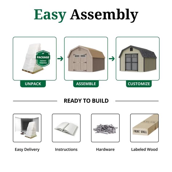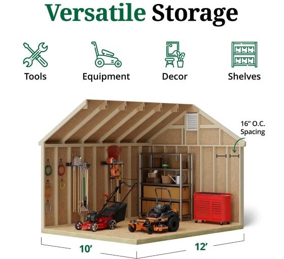 The Colonial Williamsburg Shed brings classic colonial elegance and dependable storage to your outdoor space. Designed with a traditional gable roof, decorative colonial louvers, and extended roof overhangs, this shed adds architectural charm while delivering everyday functionality. Whether used as a pool house, potting shed, garden retreat, or general storage solution, it enhances both the look and usability of your backyard. Built for strength and longevity, the shed features solid 2x4 wood construction and high-quality 7/16 in. LP SmartSide siding, engineered to resist fungal decay and insect infestation. All wood components arrive pre-cut, labeled, and ready for assembly, making installation straightforward. The siding comes factory-primed, allowing you to customize the shed with your preferred paint and shingles (sold separately).