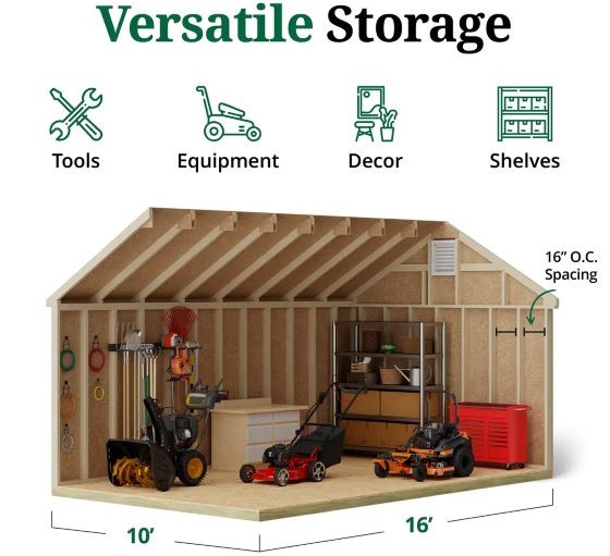 The Colonial Williamsburg Shed brings classic colonial elegance and dependable storage to your outdoor space. Designed with a traditional gable roof, decorative colonial louvers, and extended roof overhangs, this shed adds architectural charm while delivering everyday functionality. Whether used as a pool house, potting shed, garden retreat, or general storage solution, it enhances both the look and usability of your backyard. Built for strength and longevity, the shed features solid 2x4 wood construction and high-quality 7/16 in. LP SmartSide siding, engineered to resist fungal decay and insect infestation. All wood components arrive pre-cut, labeled, and ready for assembly, making installation straightforward. The siding comes factory-primed, allowing you to customize the shed with your preferred paint and shingles (sold separately).