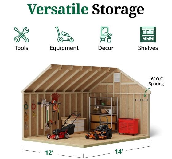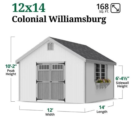 he Colonial Williamsburg Shed brings classic colonial elegance and dependable storage to your outdoor space. Designed with a traditional gable roof, decorative colonial louvers, and extended roof overhangs, this shed adds architectural charm while delivering everyday functionality. Whether used as a pool house, potting shed, garden retreat, or general storage solution, it enhances both the look and usability of your backyard. Built for strength and longevity, the shed features solid 2x4 wood construction and high-quality 7/16 in. LP SmartSide siding, engineered to resist fungal decay and insect infestation. All wood components arrive pre-cut, labeled, and ready for assembly, making installation straightforward. The siding comes factory-primed, allowing you to customize the shed with your preferred paint and shingles (sold separately).