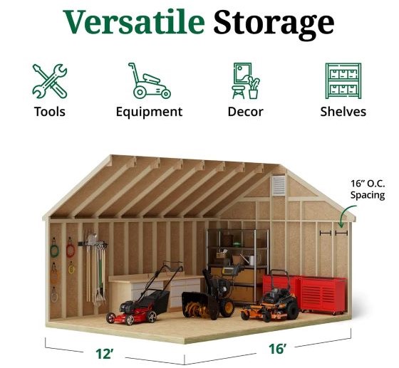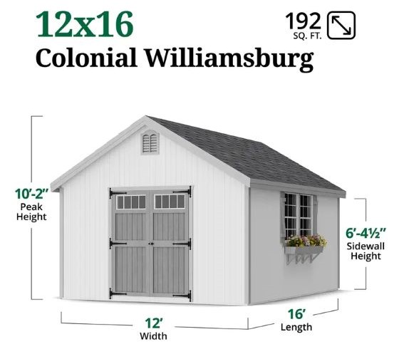 The Colonial Williamsburg Shed brings classic colonial elegance and dependable storage to your outdoor space. Designed with a traditional gable roof, decorative colonial louvers, and extended roof overhangs, this shed adds architectural charm while delivering everyday functionality. Whether used as a pool house, potting shed, garden retreat, or general storage solution, it enhances both the look and usability of your backyard. Built for strength and longevity, the shed features solid 2x4 wood construction and high-quality 7/16 in. LP SmartSide siding, engineered to resist fungal decay and insect infestation. All wood components arrive pre-cut, labeled, and ready for assembly, making installation straightforward. The siding comes factory-primed, allowing you to customize the shed with your preferred paint and shingles (sold separately).