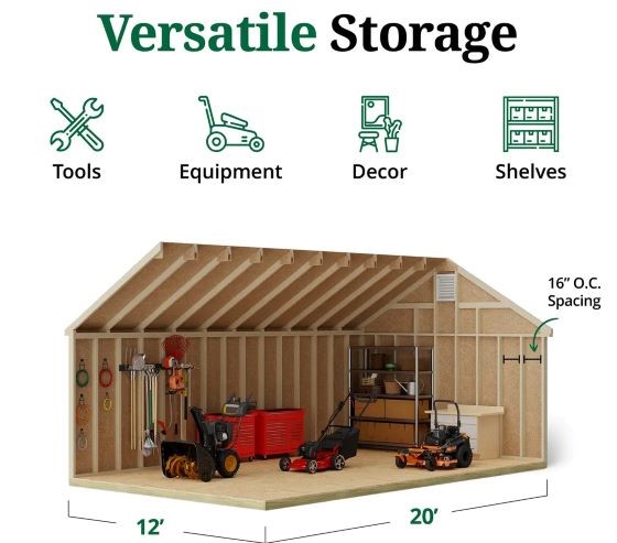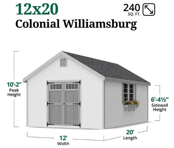 The Colonial Williamsburg Shed brings classic colonial elegance and dependable storage to your outdoor space. Designed with a traditional gable roof, decorative colonial louvers, and extended roof overhangs, this shed adds architectural charm while delivering everyday functionality. Whether used as a pool house, potting shed, garden retreat, or general storage solution, it enhances both the look and usability of your backyard. Built for strength and longevity, the shed features solid 2x4 wood construction and high-quality 7/16 in. LP SmartSide siding, engineered to resist fungal decay and insect infestation. All wood components arrive pre-cut, labeled, and ready for assembly, making installation straightforward. The siding comes factory-primed, allowing you to customize the shed with your preferred paint and shingles (sold separately).