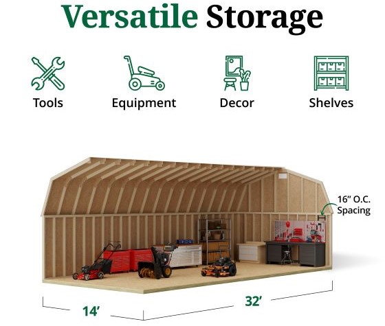 The Classic Gambrel Large Barn is designed to provide roomy, functional storage while adding a classic barn-style look to your backyard. Its tall 6-ft sidewalls and steep gambrel roof create a spacious interior, making it ideal for storing tools, lawn equipment, seasonal items, and more. Constructed with strong 2x4 wood framing, this barn is built to withstand outdoor elements and provide reliable durability. The high-quality 7/16 in. LP SmartSide siding is treated to resist fungal decay and insect damage, comes factory-primed, and is ready to be painted to match your style. All wood components are pre-cut, labeled, and ready for straightforward assembly.