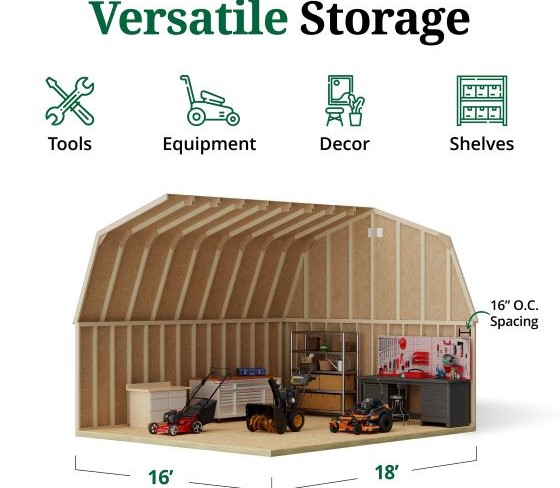 The Classic Gambrel Large Barn is designed to provide roomy, functional storage while adding a classic barn-style look to your backyard. Its tall 6-ft sidewalls and steep gambrel roof create a spacious interior, making it ideal for storing tools, lawn equipment, seasonal items, and more. Constructed with strong 2x4 wood framing, this barn is built to withstand outdoor elements and provide reliable durability. The high-quality 7/16 in. LP SmartSide siding is treated to resist fungal decay and insect damage, comes factory-primed, and is ready to be painted to match your style. All wood components are pre-cut, labeled, and ready for straightforward assembly.