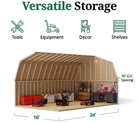 The Classic Gambrel Large Barn is designed to provide roomy, functional storage while adding a classic barn-style look to your backyard. Its tall 6-ft sidewalls and steep gambrel roof create a spacious interior, making it ideal for storing tools, lawn equipment, seasonal items, and more. Constructed with strong 2x4 wood framing, this barn is built to withstand outdoor elements and provide reliable durability. The high-quality 7/16 in. LP SmartSide siding is treated to resist fungal decay and insect damage, comes factory-primed, and is ready to be painted to match your style. All wood components are pre-cut, labeled, and ready for straightforward assembly.