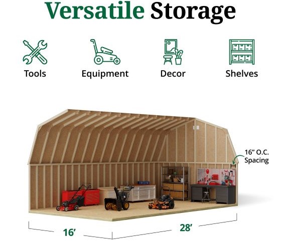 The Classic Gambrel Large Barn is designed to provide roomy, functional, and reliable backyard storage with a traditional barn-style appearance. Tall 6 ft. sidewalls and a steep gambrel roof maximize interior headroom, making it ideal for storing tools, lawn equipment, seasonal items, and more. Built with durable 2x4 wood framing, this barn is engineered to withstand outdoor elements while offering long-lasting performance. The high-quality 7/16 in. LP SmartSide siding is treated to resist fungal decay and insect infestation, comes primed and ready to paint, and is backed by a 50-year limited warranty. All wood components are pre-cut, clearly labeled, and ready for assembly, ensuring a smoother installation process.