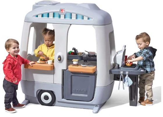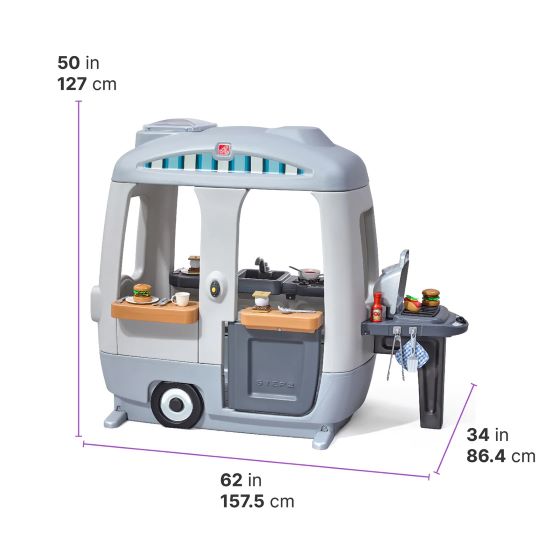 Let the adventures begin with the Step2 Adventure Camper! Packed with engaging pretend-play activities, this camper is perfect for building social skills and sparking imagination. Its compact design features a charming vintage look, neutral colors, and an open-concept layout with large windows and a Dutch-style door—making it easy for adults to supervise while kids play. Built with Ever Tough construction for exceptional durability, this play camper is ready for years of fun. Kids can grill up a pretend meal with the Stack’n’Stay food set, ring the working doorbell to announce their arrival, and relax on the molded-in kitchen chair as they cook and entertain friends. The realistic kitchen setup includes a spacious sink with faucet, prep counter, stove top with clicking knobs, and plenty of storage underneath.