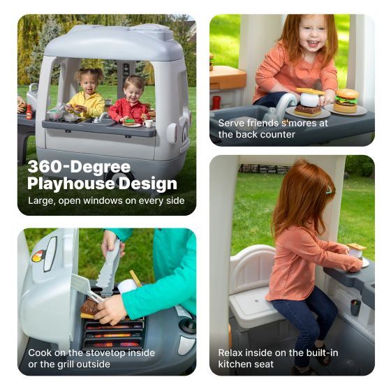 Gear up for big backyard adventures! A kid-sized camper playhouse featuring a mini kitchen, open-concept interior, and fun accessories perfect for imaginative outdoor adventures. Lets little explorers cook, play, and imagine their own fun-filled getaway. For more details, call us at 1-888-609-5487.