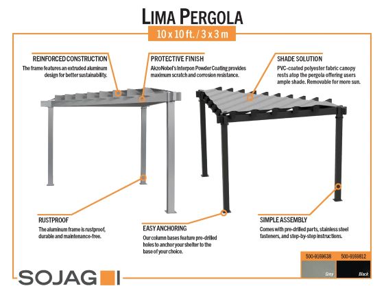 Enhance your outdoor living area with the stylish and functional Sojag Lima 10 x 10 ft. Pergola. Its contemporary triangular design adds a modern touch to any backyard, patio, or poolside setting. Constructed with a rustproof, highly corrosion-resistant aluminum frame, this pergola offers durability and long-lasting performance. The high-quality PVC-coated polyester canopy provides ample shade on hot, sunny days, creating a comfortable and inviting outdoor oasis. Perfect for relaxing, entertaining, or lounging, the Lima Pergola is an excellent addition to elevate your outdoor living experience.